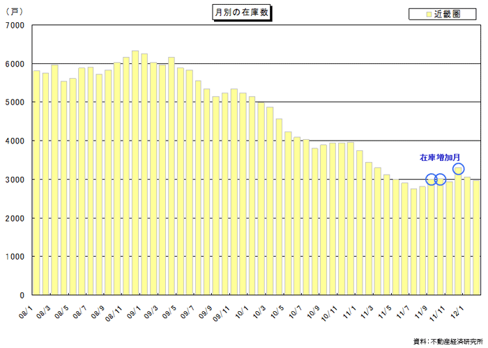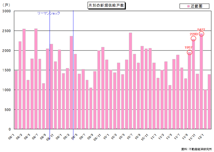 供給量は2010年に入り若干回復に転じたかに見えますが、2011年には再び低下するという状況で回復の兆しは見えません。2010年12月以降では月間新規供給2000戸越えは11/10・11/12の2ヶ月しかないという状況です。(注)