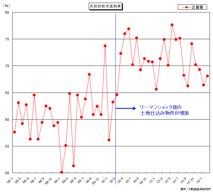 急ピッチで減少を続けてきた在庫数もここ5ヶ月は横這い状態です。また新規供給戸数が2000戸前後以上で在庫が増える(2011年9月-供給1957戸・在庫前月比175戸増、2011年10月-供給2283戸・在庫前月比28戸増、2011年12月-供給2427戸・在庫前月比363戸増)という状況であり、低水準供給量に支えられた高水準成約率といえそうです。(注)
