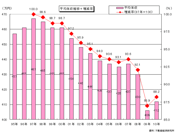業者数の減少と供給意欲の低下が供給側からみた2万戸市場要因といえるでしょう。無論、背景としてお金が融通されない金融の要因もあります(世界金融危機と分譲マンション市場については別の機会に記します)。しかし、需要が旺盛であれば供給意欲が向上し、市場拡大も見込まれますが、残念ながら、需要者の購買力は大幅に低下しているのが実情です。